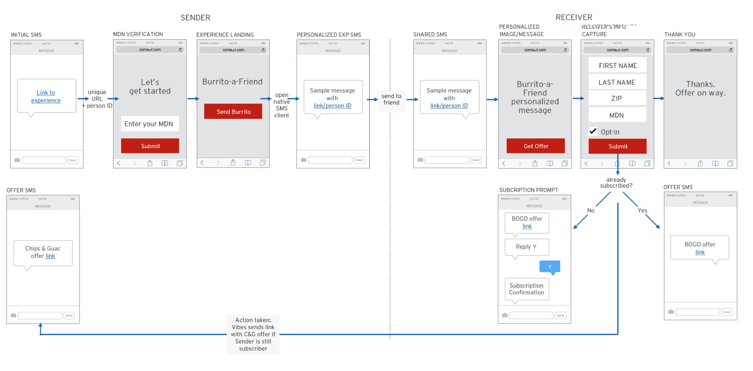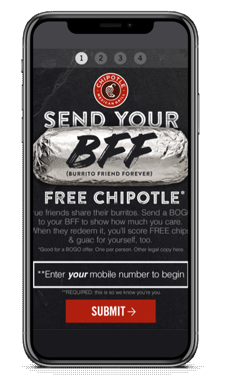 • Friends recieve card with a Buy One, Get One Free offer and prompted to sign up for future Chipotle promotions mobile alerts