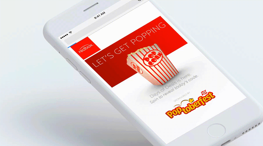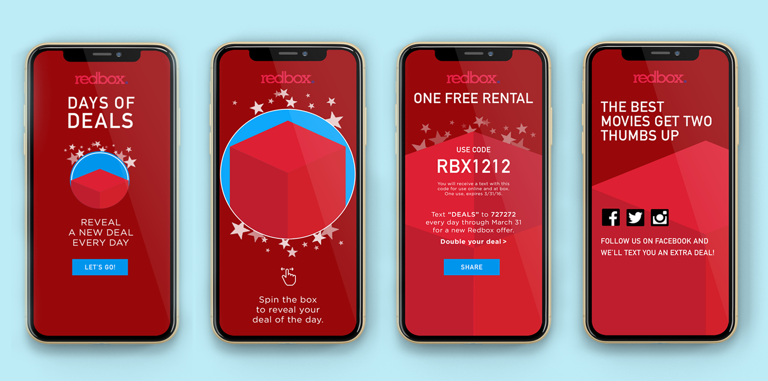 An SMS link drives to a mobile web experience. Finger swipe across the screen spins the “Box” to reveal an offer. Post experience, drive to social outlets for extra deals.
