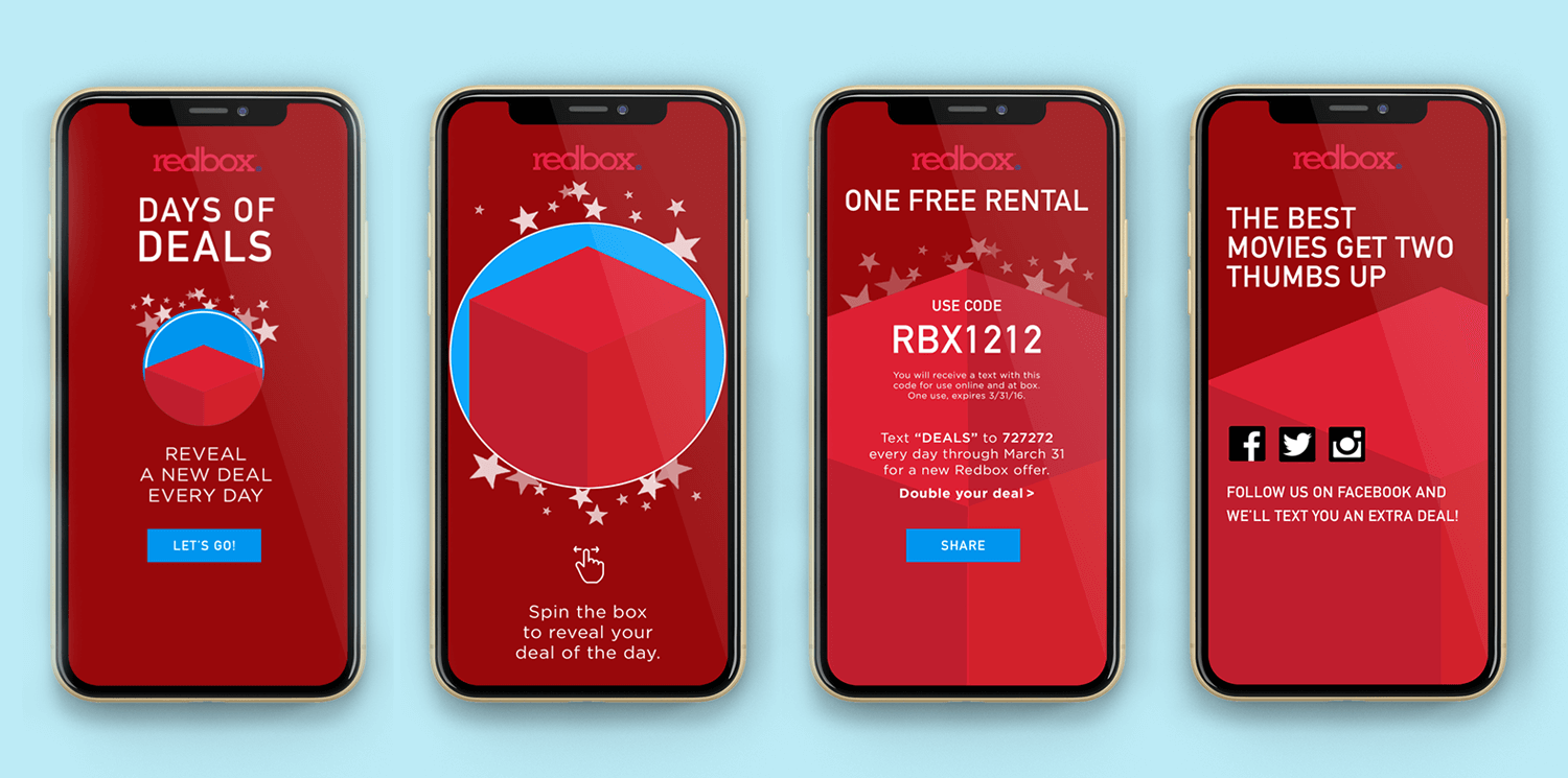 We reconceived their semi-annual Days of Deals re-engagement campaign as a mobile web experience that reflected the playful attitude of the Redbox brand. These touch interactions were colorful, simple, scalable across multiple devices, and encouraged repeat visits. Mobile Wallet functionality was added for easy access and storage of different offers across multiple programs.